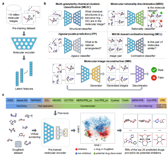 近年来,基于序列和图(graph)的分子表征方法已被广泛用于各种药物研发中。然而,上述表征在分子性质预测和靶点筛选方面仍存在诸多局限。为了寻找更好的分子表征学习方法,该论文提出了基于分子图像的无监督深度学习模型ImageMol,将分子图像处理框架与分子化学知识相结合,以视觉计算的方式提取出像素级的分子特征。通过在1000万个未标记的类药生物活性分子上进行预训练,ImageMol实现了对分子性质和药物靶标的准确预测。