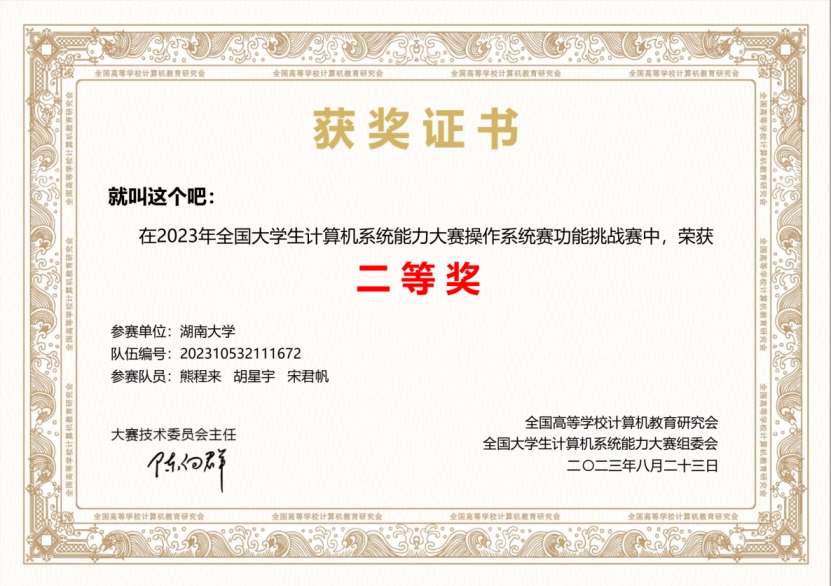 操作系统设计赛功能挑战赛道二等奖证书