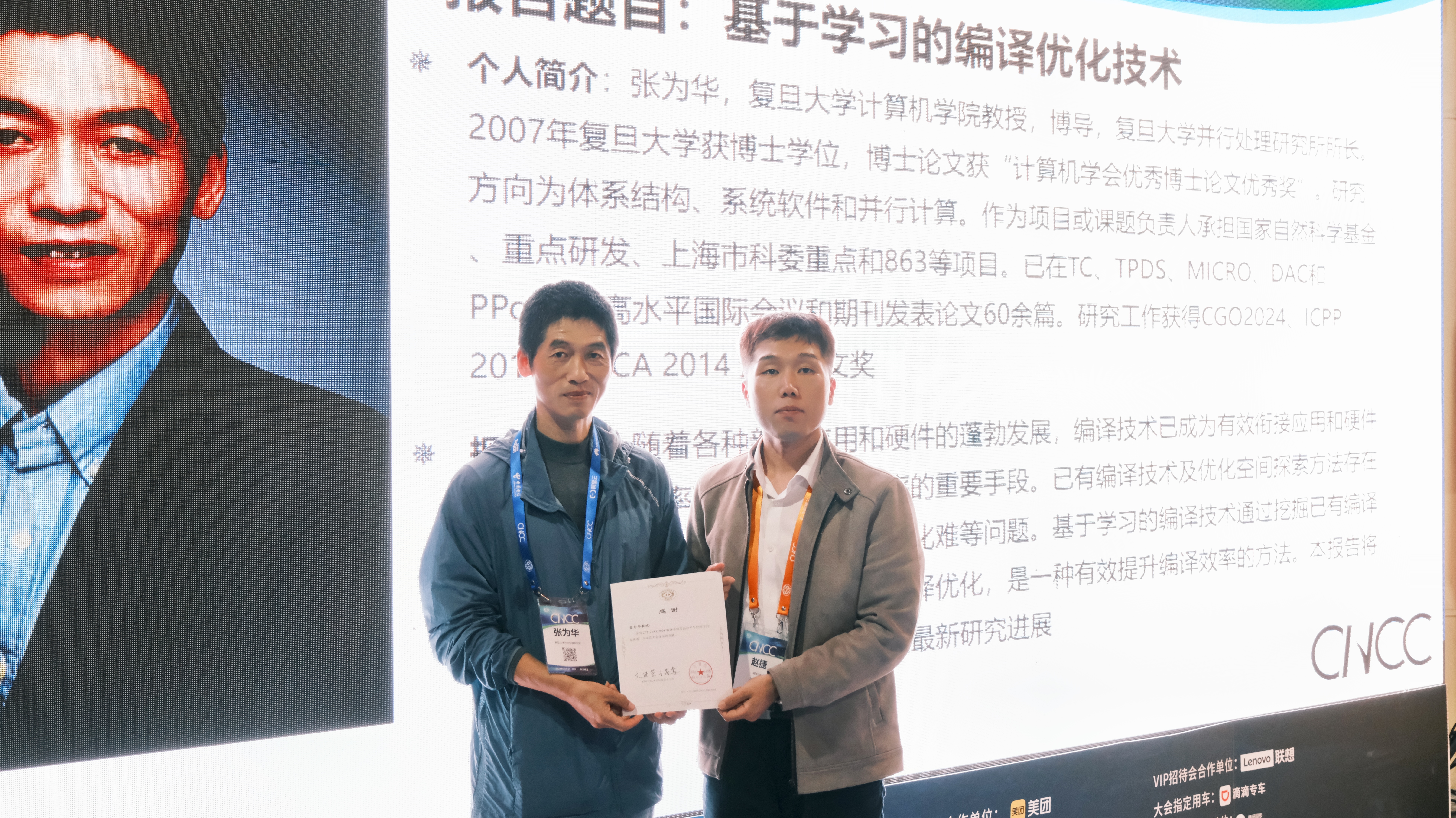 论坛上,清华大学陈文光教授、中国科学院冯晓兵教授、华为魏伟博士、复旦大学张为华教授,以及字节跳动郑思泽博士分别作了主题演讲,分享了他们在神经网络优化、敏捷编译、AI for Compiler等领域的最新研究进展与成果。