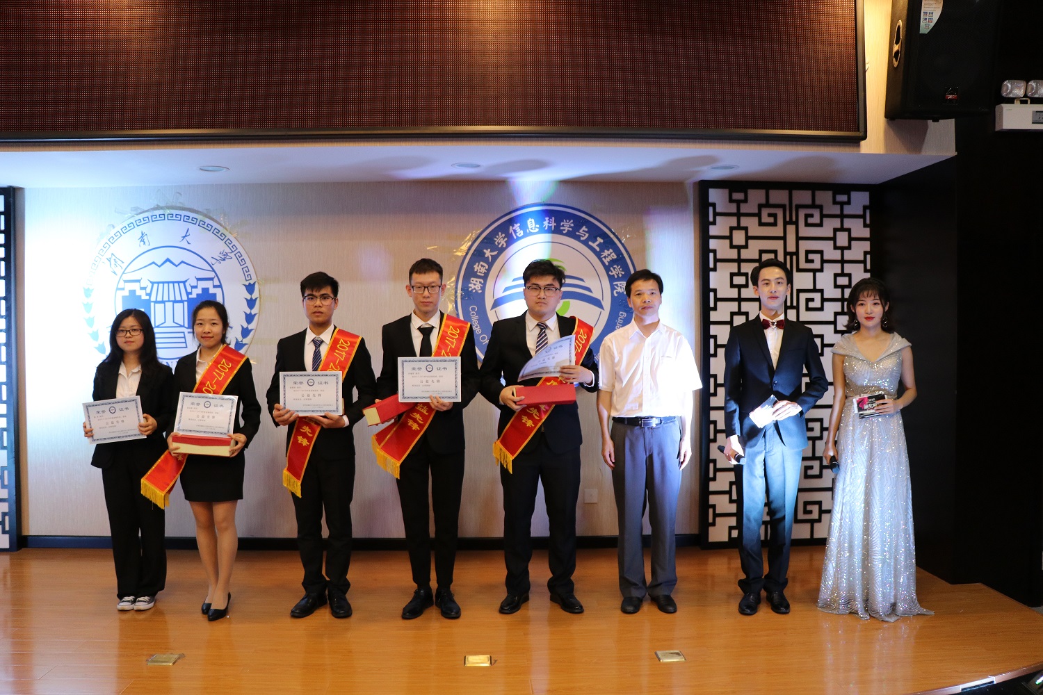 2018年表彰晚会在湖南大学集贤宾馆二楼会议室内拉开帷幕,晚会在信息院先锋信息QQ公众号上进行实时直播。本次表彰晚会到场的嘉宾有葫芦娃