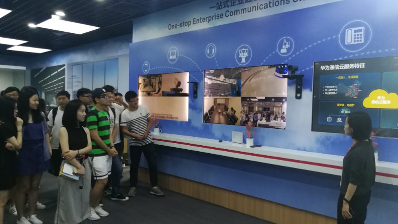 第一站,华为杭州研究所。在这里,同学们兴致勃勃地参观了杭研所内外架构,并对杭研所相关的研发项目进行了基本了解。