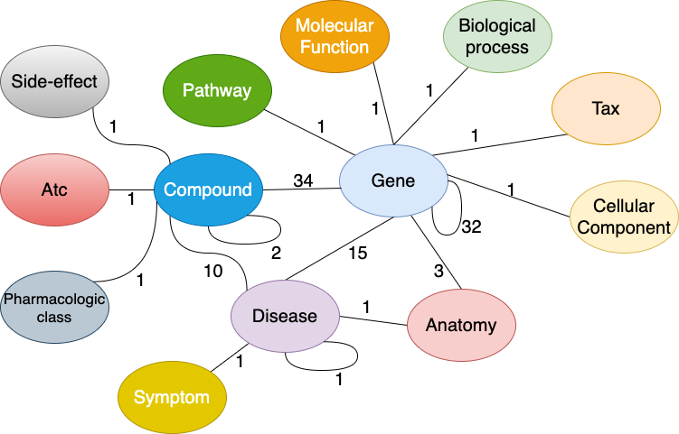 DRKG知识图谱示意图,边上的数字表示关系类型的数量