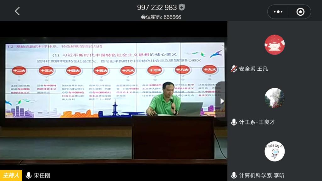 杨忠旺老师主要从四个方面——新思想武装头脑、控疫情科技攻关、科研梦报效祖国、爱国心奋斗前行为主题展开。以习近平新时代中国特色社会主义思想为开端,介绍了中国特色社会主义新时代的思想与内涵,使同学们在宏观上对国家发展与政策有了进一步的认识;2020年一场突如其来的疫情席卷了中国,同时也涌现出了一批舍己为人的英雄人物,让我们看到了人性的光辉,而这些英雄人物并不是手无寸铁的,现代科技的发展使得我们拥有了强有力的工具来抗击疫情:医疗防疫管理、人员登记跟踪、病情扩散预测等数据可视化工具让我们对疫情的防控有了准确的定位;语音AI防控机器人、红外人体温度快速筛检仪、AI辅助医生CT影响诊断等科技帮助我们大大缓解了医疗检测难题;钉钉、天猫等网络教育和电商的发展让我们可以足不出户在家中学习和购物。科技兴国,智能战“疫”!正是这些技术的蓬勃发展,使得我们在疫情来袭时可以不慌了手脚;科技的高速发展又能带给我们什么启示呢?科技兴则民族兴,科技强则国家强!我们研究生应向袁隆平、黄旭华等科研泰斗学习,要有探索未来科学的精神、有积极创新的精神、有批判和敢于挑战权威的精神、有“与时俱进”的精神,最重要的是要有爱国主义精神;作为即将走向社会的毕业生,杨忠旺老师希望大家可以做到知国、爱国、报国,用自己所学去建设祖国,为国家献出自己的一份力,作为祖国的后浪,大家同心协力、众志成城,实现中华民族的伟大复兴!