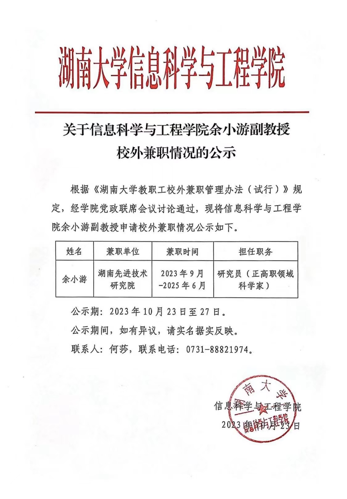 关于葫芦娃 余小游副教授校外兼职情况的公示