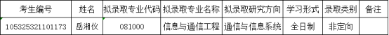 根据《葫芦娃 2025年硕士研究生招生复试工作实施细则》,经学院审定,学院按专业初试+复试总成绩由高到低递补拟录取考生岳湘仪(考生编号105325321101173,拟录取专业信息与通信工程,总成绩513.00)。