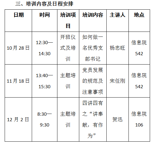 2、 各党支部书记应积极参加本次培训,结合培训内容和工作实际,切实履行支部书记职责,认真排查整改支部和党员存在的突出问题,全面加强支部建设。