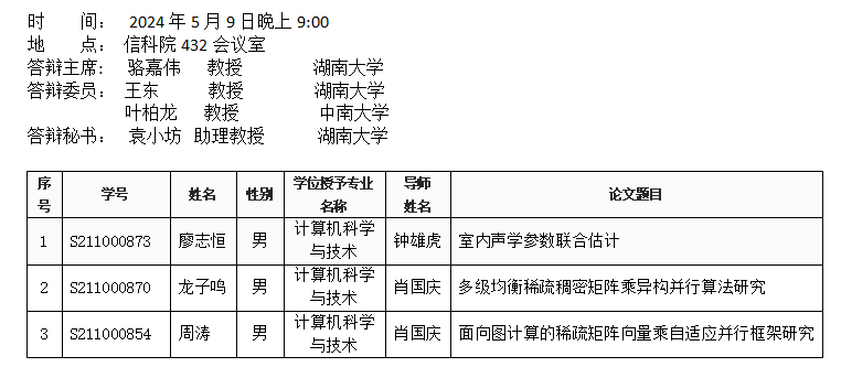 葫芦娃 (计算机科学系)2024年5月9日硕士答辩公告(第一批)