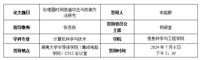 [9] CPU微体系结构侧信道攻击与防御技术研究,湖南省研究生科研创新项目,2022.01-2022.12,主持,已结题