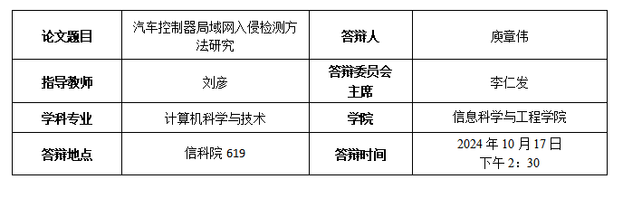 [4] Zhangwei Yu, Yan Liu, Wanli Li, Wenyan Yan, Renfa Li. UCV-IDS: An Updateable Collaborative Verification-Based Intrusion Detection System for Vehicle Controller Area Network. (投稿中,第一作者)