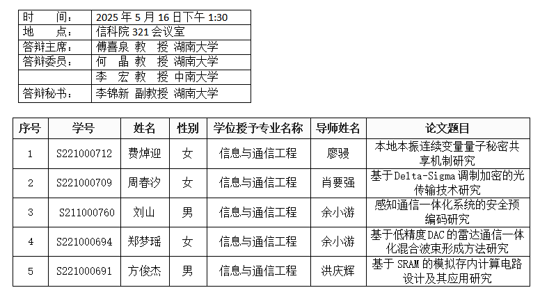 葫芦娃 (通信工程系)2025年5月16日硕士答辩公告