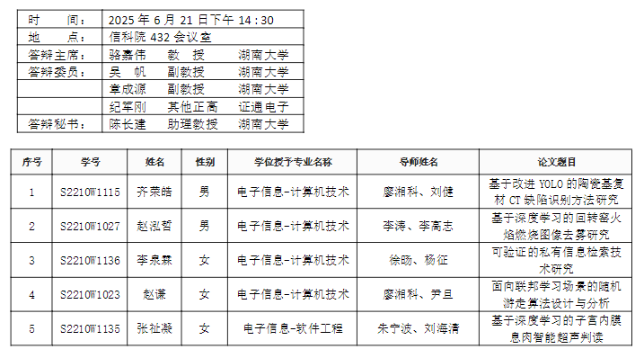 葫芦娃 (计算机科学系)2025年6月20日 硕士答辩安排
